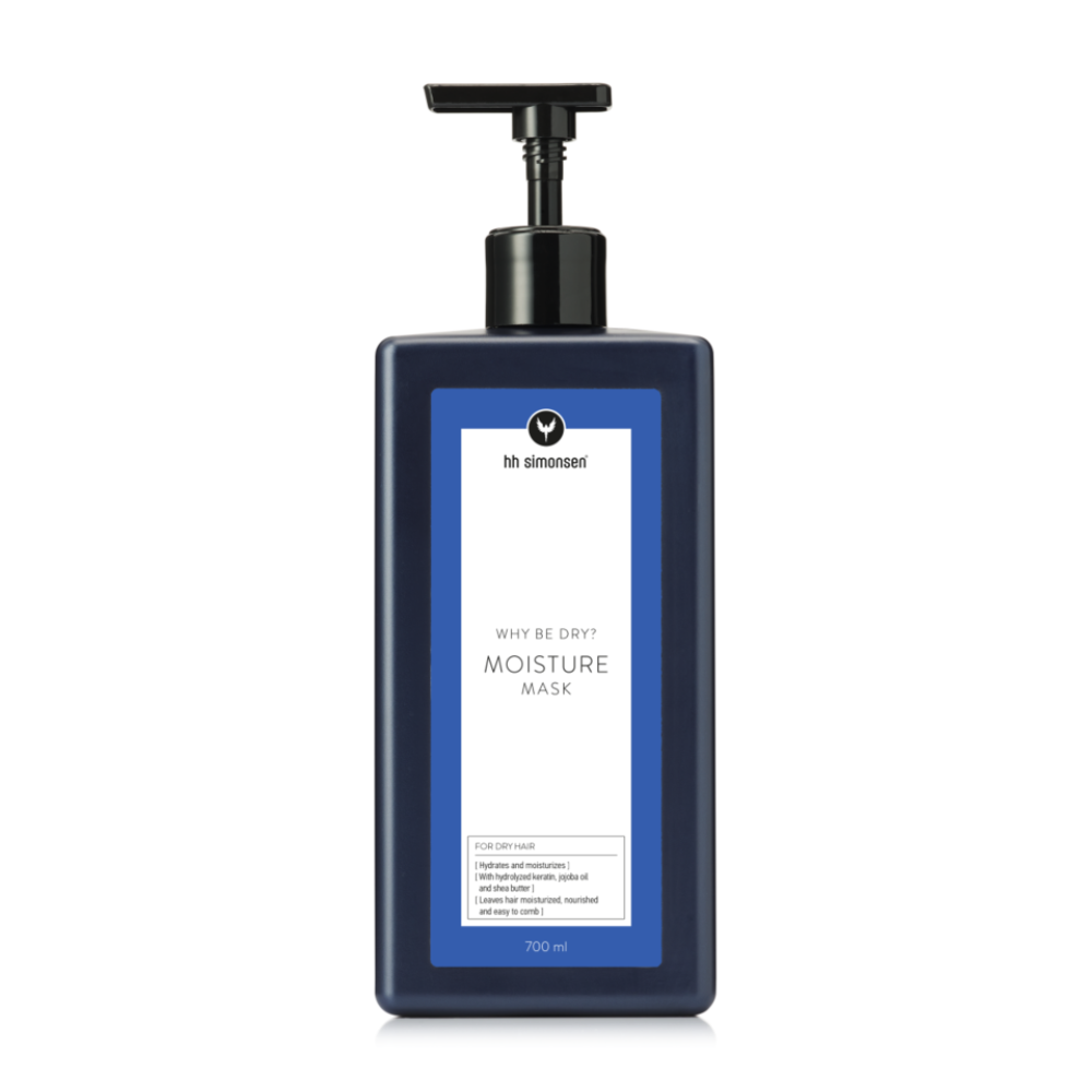 HH Simonsen Moisture Mask – on intensiivinen hiushoito kuiville ja elottomille hiuksille. Naamio on formuloitu toimimaan pääasiassa (70 %:sesti) palauttamaan kosteuden ja keratiinipitoisuuden syvällä hiuksessa ja lisäksi (30%:sesti) hoitamaan hiuksen kutikulaa ulkopuolelta. Uniikki yhdistelmä hydrolysoitua keratiinia, vehnäpohjaisia aminohappoja, Marine Complex – uutetta ja erityisiä molekyylejä keratiiniominaisuuksilla auttaa tuomaan runsaasti kosteutta hiuksiin ja päänahkaan sekä säilyttämään kosteuden.
